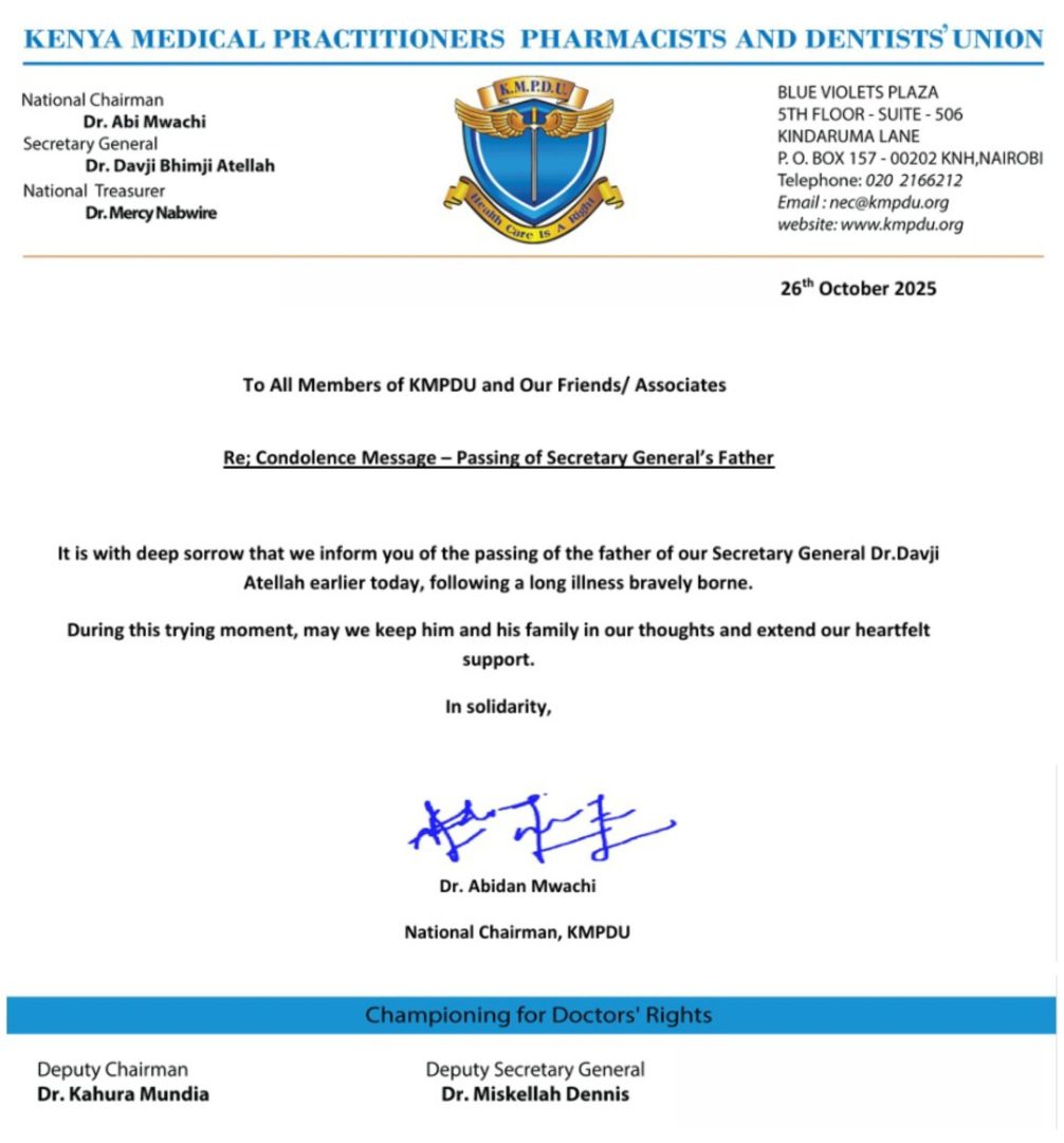 We deeply regret to announce the passing of Dr. Davji Bhimji Atellah’s father earlier today. Mzee had bravely battled a chronic illness for some time and, until recently, remained in remarkably high spirits and sound mind. As we mourn this profound loss, we extend our heartfelt condolences and prayers for grace, strength, and calm to our Secretary General and his entire family during this difficult time. The loss of a father brings with it deep emotional and familial shifts, may they find comfort in the love and support of those around them.